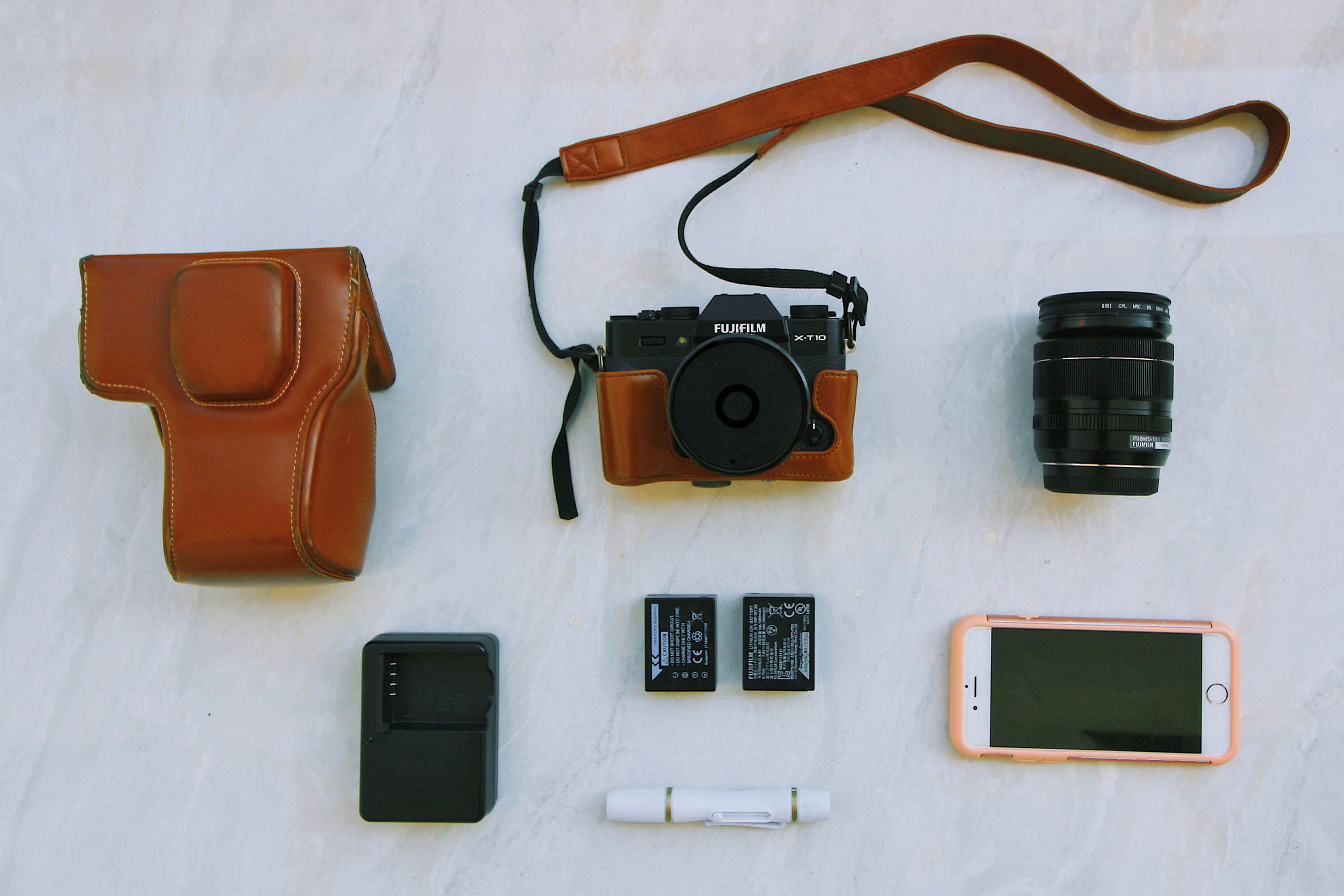 Photographing on the go often means preparing a line of defence for the inevitable hiccup — be it a malfunctioning SD card or drained battery (due to cold exposure, for example). Given that these two are essential to photographing, I always carry spare batteries and SD cards. I like to keep the rest minimal: a LensPen for basic maintenance, and a nice and light strap for easy wearing throughout the day.